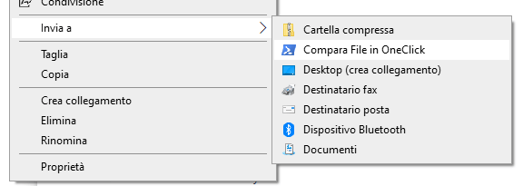 La nostra funzionalità è già disponibile e non richiede nessun riavvio, selezioniamo i files che vogliamo confrontare, click destro -> “Invia a” -> “Compara File In OneClick”.
